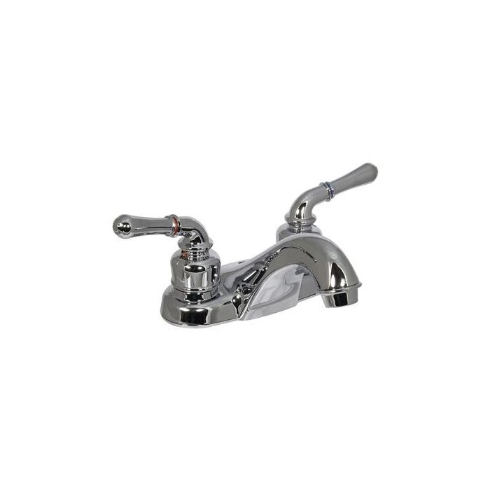 Faucet; Catalina; Used For Lavatory; Single Piece 4 Inch Deck Mount; Low-Arc Spout; 2 Teapot Handle; Polished Chrome Plated/ Plastic Underbody; 2 Hole Application; 1/4 Turn Washerless Valve;